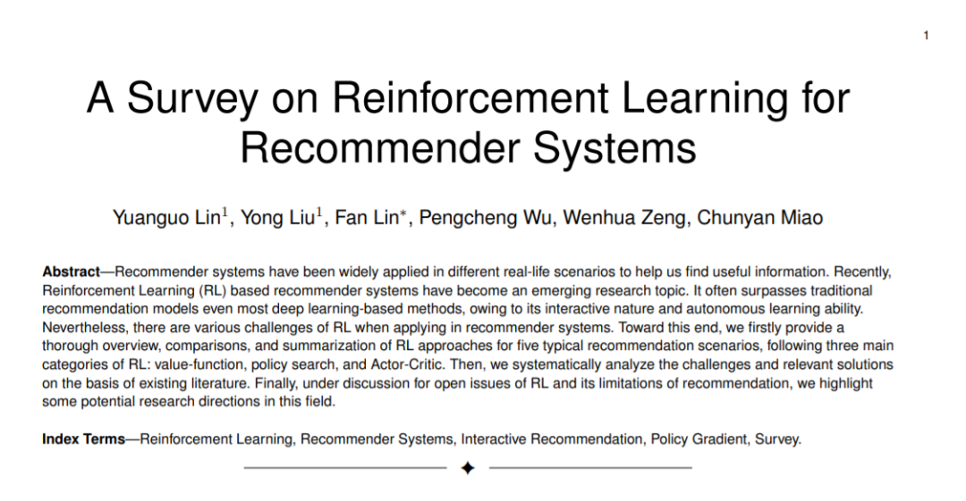 厦大最新《强化学习推荐系统》综述论文推荐系统如何使用强化学习一直是个难题。最近,来自厦门大学的研究人员发布了《基于强化学习的推荐系统》综述论文,详细阐述了强化学习推荐系统的问题、方法、挑战等。 摘要 推荐系统已经被广泛应用于不同的现实生活场景,帮助我们找到有用的信息。近年来,基于强化学习(RL)的推荐系统已经成为一个新兴的研究课题。由于其交互性和自主学习能力,它常常